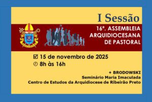 As paróquias tem até 25 de outubro para enviarem a Síntese Paroquial. O prazo limite para Inscrição se encerra em 09 de novembro. Caminhemos Juntos na I SESSÃO da 16ª. Assembleia Arquidiocesana de Pastoral, em 15 de novembro de 2025, das 8h às 16h, nas dependências do Seminário Maria Imaculada e Centro de Estudos da Arquidiocese de Ribeirão Preto, em Brodowski.