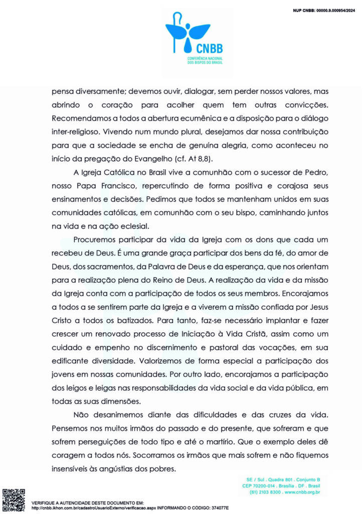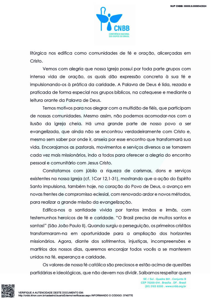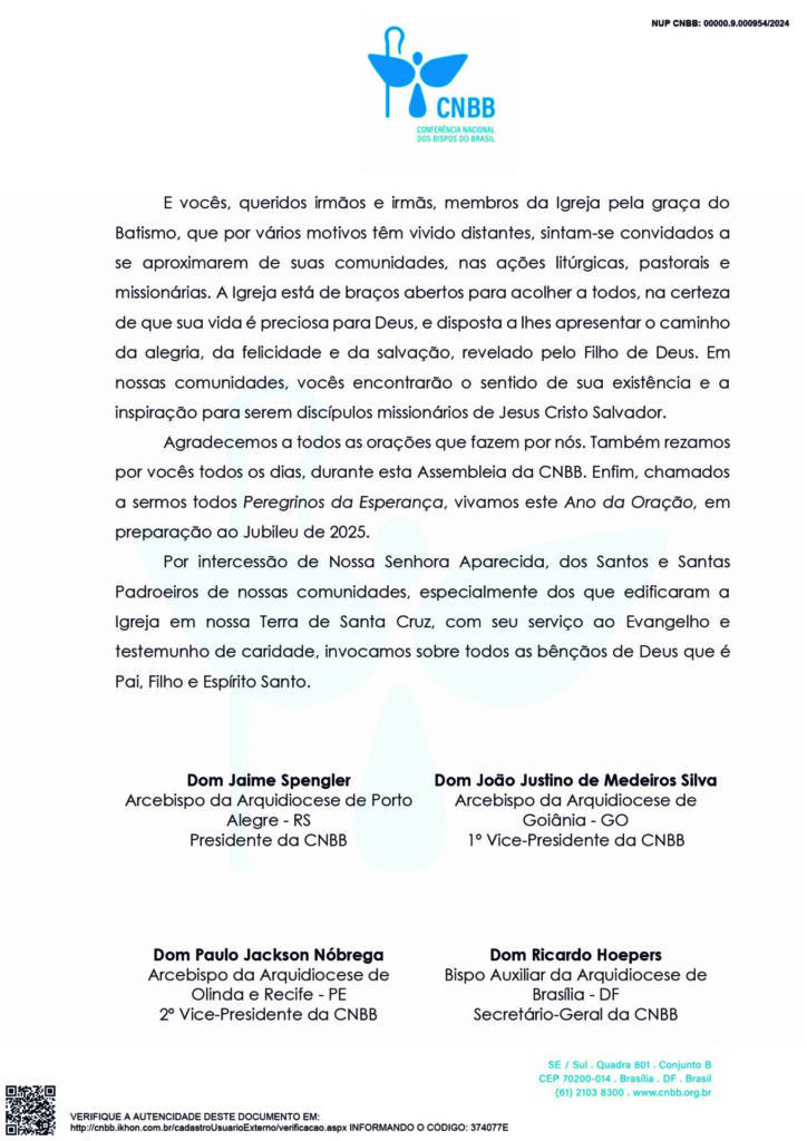 A mensagem ressalta a necessária comunhão com o Papa e com os bispos e faz um convite a não desanimar diante das dificuldades presentes e à participação ativa na vida das comunidades e da sociedade. Finalmente, um chamado à preparação ao Jubileu 2025. De acordo com dom Odilo, trata-se de uma carta que pretende “encorajar, orientar, apoiar, respaldar a nosso povo católico”.