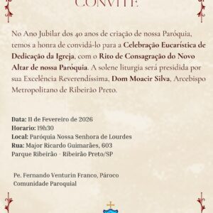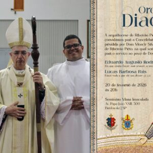 A Arquidiocese de Ribeirão Preto, nossas famílias e nós, convidamos para a Concelebração Eucarística, presidida por Dom Moacir Silva, Arcebispo Metropolitano de Ribeirão Preto, na qual seremos ordenados diáconos para o serviço ao povo de Deus: Eduardo Augusto e Lucas Barbosa