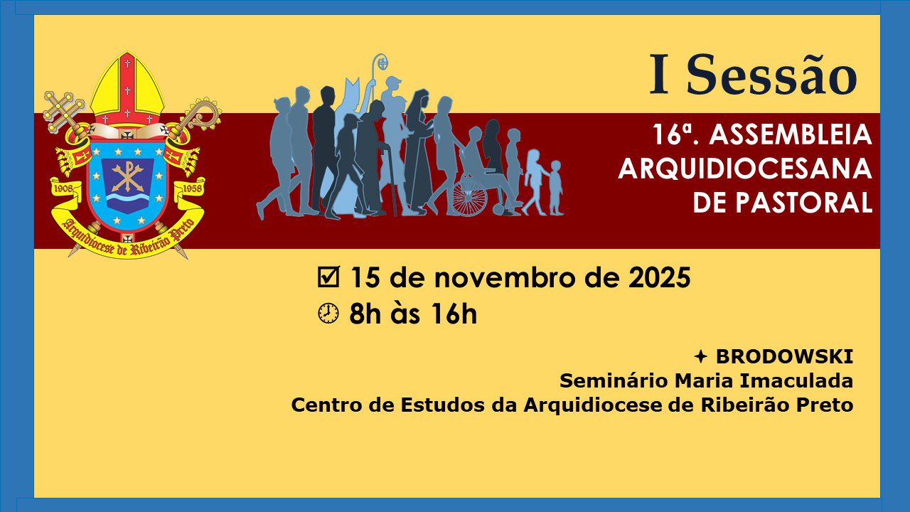 As paróquias tem até 25 de outubro para enviarem a Síntese Paroquial. O prazo limite para Inscrição se encerra em 09 de novembro. Caminhemos Juntos na I SESSÃO da 16ª. Assembleia Arquidiocesana de Pastoral, em 15 de novembro de 2025, das 8h às 16h, nas dependências do Seminário Maria Imaculada e Centro de Estudos da Arquidiocese de Ribeirão Preto, em Brodowski.