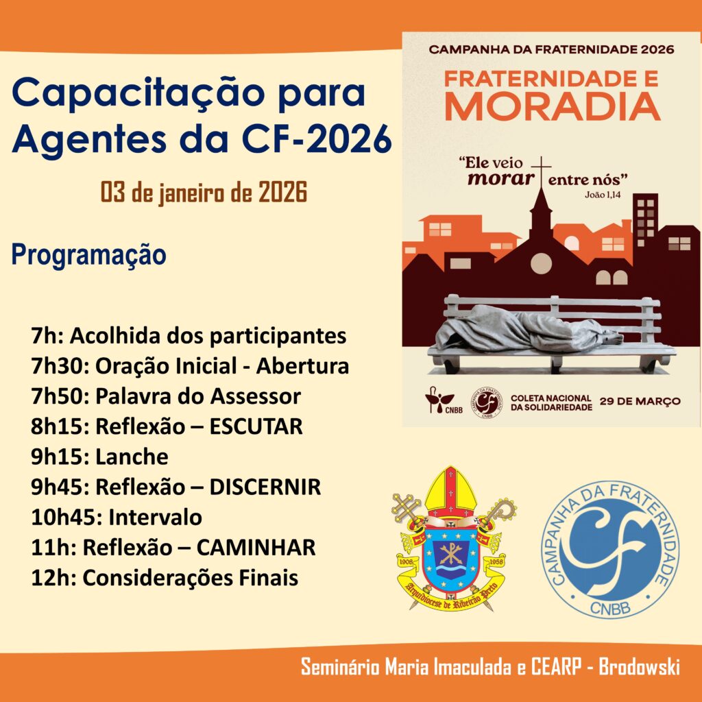 Com o tema: “Fraternidade e Moradia” e o lema: “Ele veio morar entre nós” (Jo 1,14), a Equipe Arquidiocesana de Campanhas, promove em 03 de janeiro de 2026, das 7h às 12h, no Seminário Maria Imaculada e Cearp, em Brodowski, a Capacitação para Agentes da Campanha da Fraternidade 2026.