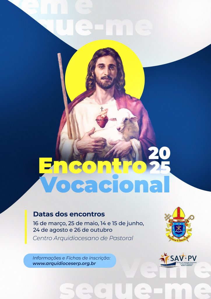 Encontros: Os encontros vocacionais serão realizados nas seguintes datas: 16 de março, 25 de maio, 14 e 15 de junho, 24 de agosto e 26 de outubro.