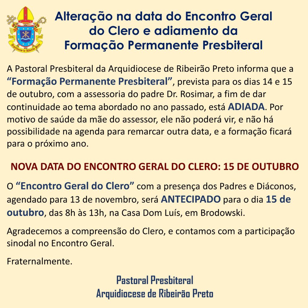 O “Encontro Geral do Clero” com a presença dos Padres e Diáconos, agendado para 13 de novembro, será ANTECIPADO para o dia 15 de outubro, das 8h às 13h, na Casa Dom Luís, em Brodowski.