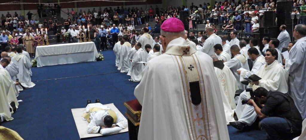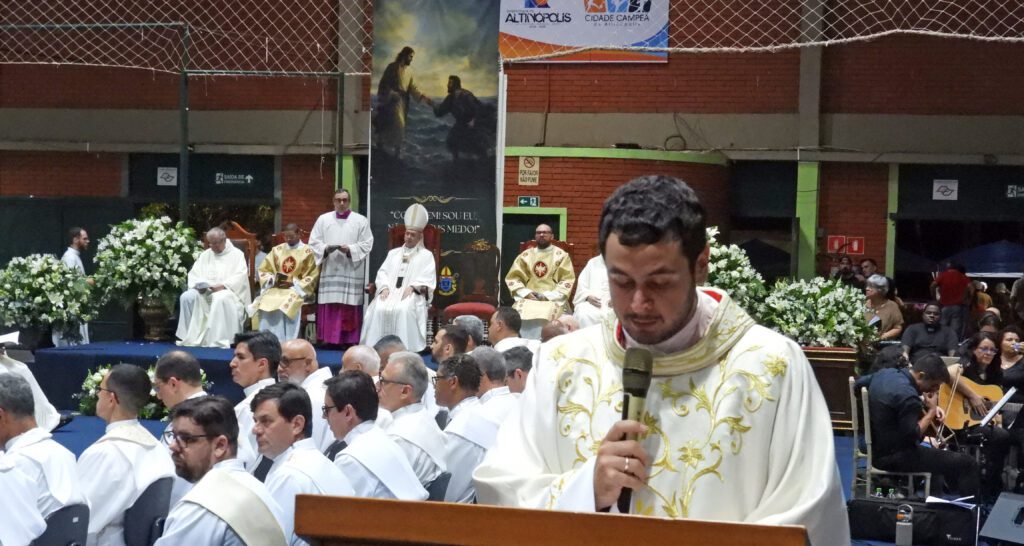 Com o lema sacerdotal: “Coragem! Sou Eu. Não tenhais medo!”, em 14 de novembro, na Quadra Municipal de Esportes Erasmo Florindo de Medeiros Castro, organizada pela paróquia Nossa Senhora da Piedade, em Altinópolis, foi ordenado presbítero o então diácono transitório, Leandro Júnior Leite, em celebração presidida pelo Arcebispo Dom Moacir Silva. Após 55 anos, a cidade de Altinópolis recebeu e acolheu novamente uma ordenação presbiteral, e com alegria reuniu o povo de Deus no Ano Santo de Nosso Senhor Jesus Cristo: “Peregrinos de Esperança”, para rezar pelas vocações e pelo padre Leandro, natural do munícipio. A celebração reuniu padres, diáconos, seminaristas, religiosos e religiosas, e grande número de fiéis.