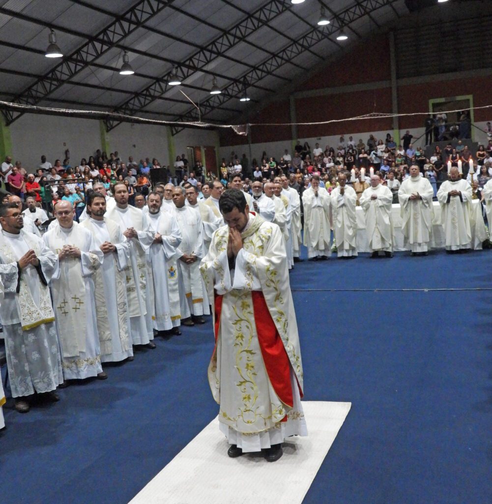 O ordinando, diácono Leandro Júnior Leite, falou das expectativas e da emoção de estar prestes a receber a ordenação sacerdotal em sua cidade natal. “Primeiramente, eu sou muito grato à Igreja, que me deu toda a estrutura formativa, e hoje eu concluo um dos processos. Tenho certeza que a ordenação não é um ponto de chegada, mas, sim um ponto de partida. Até hoje a Igreja ofereceu todas as estruturas de formação do qual eu pude usufruir para me trabalhar, para agora colocar tudo aquilo que eu aprendi, tudo aquilo que trabalhei, a serviço do povo de Deus, a serviço do povo santo fiel de Deus. Espero ser bem-sucedido e corresponder às expectativas do sacerdócio que Cristo pede para mim, da minha história, da minha vida e da minha vocação. Então, de minha parte, eu vou dedicar o meu melhor e conto sempre com o auxílio da graça de Deus, para que corresponda à vontade do Sagrado Coração de Jesus. Sendo o próprio Cristo que me chamou, o Cristo ressuscitado. Foi em uma semana santa, uma semana de Páscoa, em que eu senti o meu chamado, e hoje estou aqui juntamente com a minha comunidade para poder expressar o carinho. Minha vocação surgiu daqui. Assim como toda vocação nasce de uma comunidade que reza, um dia essa comunidade rezou e hoje estão aqui comigo colhendo os frutos. Então eu espero correspondê-los e espero ser o sacerdócio que Cristo, e o padre que a igreja espera e vai pedir de mim”, expressou o ordinando.