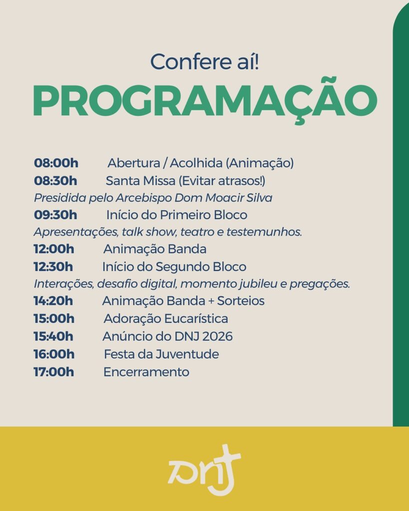 Com o tema: “Jovens de Esperança”, o Setor Juventude lançou a identidade visual do Dia Nacional da Juventude 2025 e a juventude arquidiocesana já pode fazer a inscrição. Neste ano o tema está em sintonia com o Jubileu 2025: “Peregrinos de Esperança”: a identidade visual do DNJ, especialmente criada em sintonia com o Jubileu de 2025 apresenta em detalhes a transmissão da fé e esperança, refletindo o espírito desse tempo tão especial.