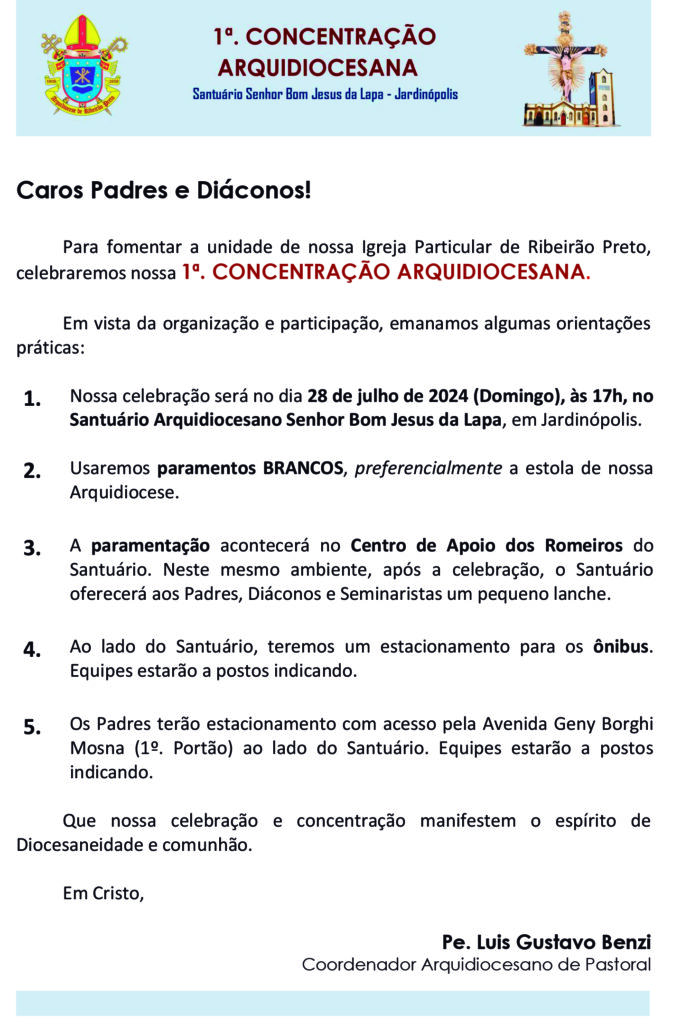 Em decreto publicado em 05 de julho de 2024, o Arcebispo Metropolitano de Ribeirão Preto, Dom Moacir Silva, institui o primeiro domingo da Novena do Senhor Bom Jesus da Lapa para a concentração arquidiocesana (Romaria Arquidiocesana), e estabelece que em 28 de julho de 2024, em todas as paróquias da Arquidiocese sejam canceladas as missas no período da tarde e da noite, favorecendo a participação do clero e dos fiéis da concentração arquidiocesana, ficando dispensadas as paróquias que tem padroeiro o Senhor Bom Jesus.