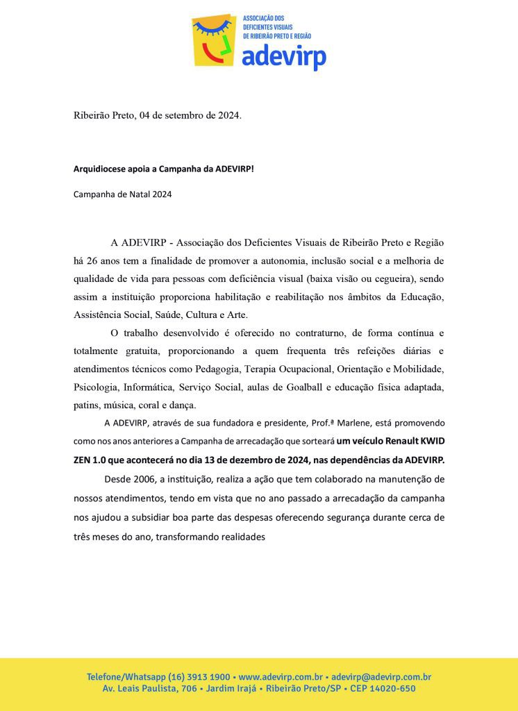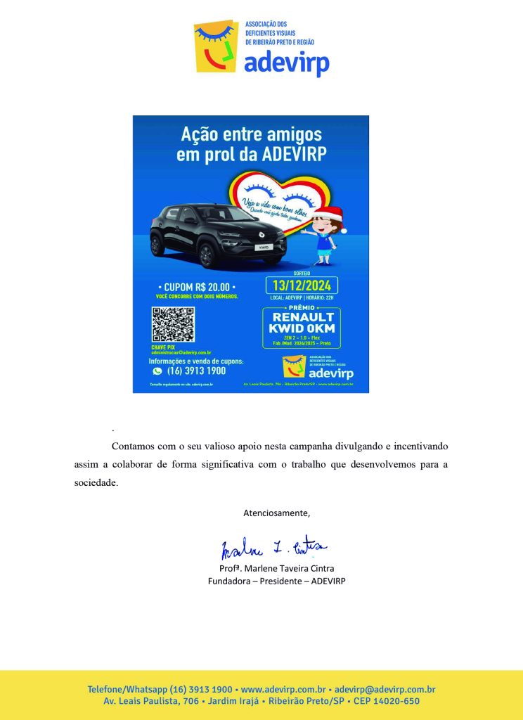 A ADEVIRP, através de sua fundadora e presidente, Prof.ª Marlene, está promovendo como nos anos anteriores a Campanha de arrecadação que sorteará um veículo Renault KWID ZEN 1.0 que acontecerá no dia 13 de dezembro de 2024, nas dependências da ADEVIRP.