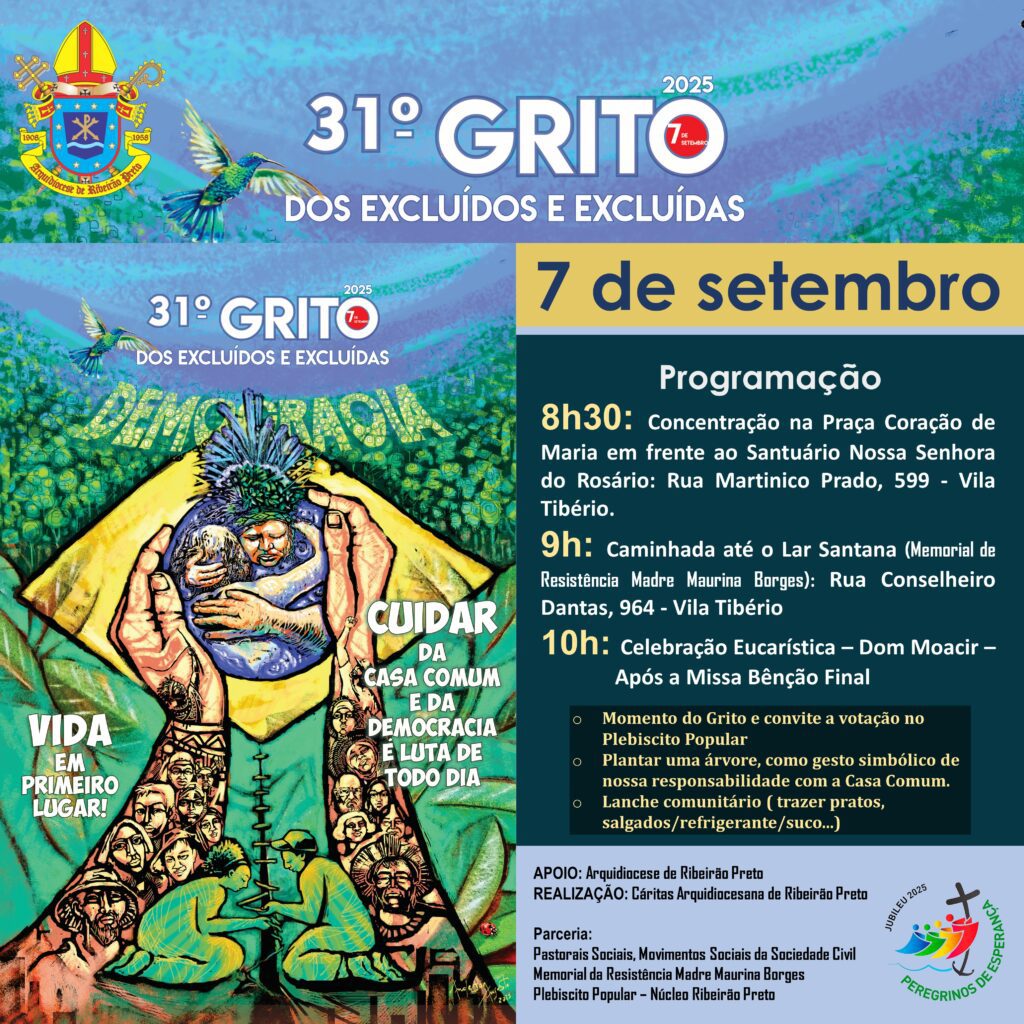 Com o tema: “Vida em primeiro lugar” e o lema: “Cuidar da Casa Comum e da Democracia é luta de todo o dia”, acontece no dia 7 de setembro (domingo), a edição do 31º Grito dos Excluídos e Excluídas com a organização da Arquidiocese de Ribeirão Preto, o apoio da Cáritas Arquidiocesana de Ribeirão Preto, e a parceria com as Pastorais Sociais, os Movimentos Sociais da Sociedade Civil, o Memorial da Resistência Madre Maurina Borges e o Plebiscito Popular – Núcleo Ribeirão Preto. Celebremos também o Jubileu dos 25 anos da Igreja, estabelecido pelo Papa Francisco, cujo lema é “Peregrinos da Esperança”.