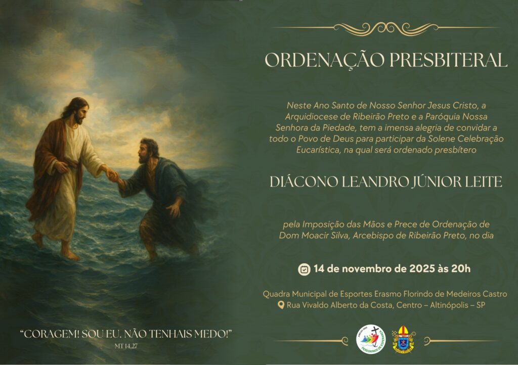 Com alegria a Arquidiocese de Ribeirão Preto acolherá três novos padres nos meses de novembro e dezembro. As ordenações presbiterais acontecerão nas cidades de Altinópolis, Brodowski e Ribeirão Preto. Após o período de formação no Seminário Maria Imaculada nas etapas da configuração, discipulado, síntese vocacional, e a ordenação diaconal transitória, os ordinandos: Carlos Alexandre Barbosa dos Santos, Leandro Júnior Leite e Luís Fernando de Oliveira, serão ordenados presbíteros pelas mãos consecratórias do arcebispo metropolitano de Ribeirão Preto, dom Moacir Silva.