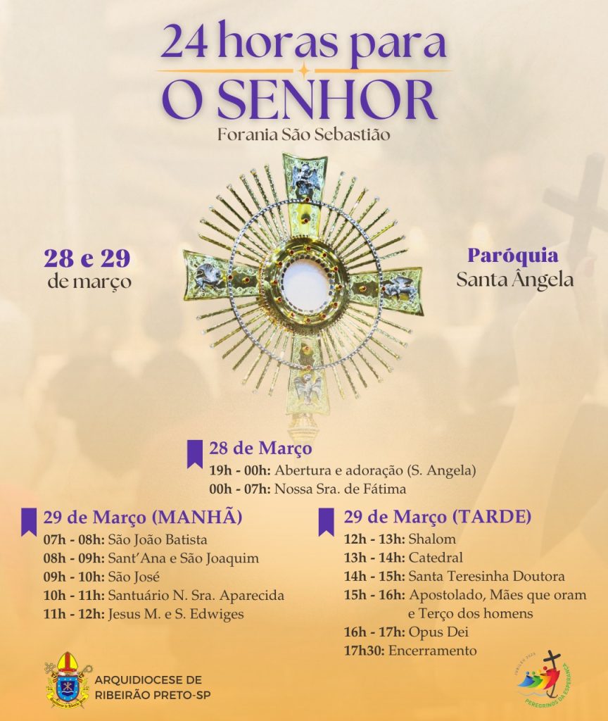 A décima segunda edição da iniciativa “24 horas para o Senhor”, convocada pelo Papa Francisco e promovido pelo Dicastério para Evangelização, ocorre na sexta e sábado precedente ao IV Domingo da Quaresma, neste ano de 2025, será vivenciada nos dias 28 e 29 de março. A edição deste ano será realizada por cidades, sendo que na cidade de Ribeirão Preto a programação da iniciativa será organizada por foranias, e ocorrerá também em algumas das cidades do território arquidiocesano.