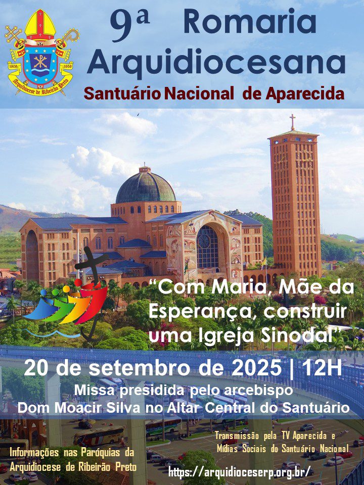 Com o tema: “Com Maria, Mãe da Esperança, construir uma Igreja Sinodal” será realizada, em 20 de setembro (sábado), a “9ª Romaria Arquidiocesana ao Santuário Nacional de Aparecida”, em Aparecida (SP), com a missa presidida pelo arcebispo dom Moacir Silva, às 12h, na Catedral Basílica de Nossa Senhora Aparecida, com transmissão pela TV Aparecida e mídias sociais do Santuário Nacional. (www.a12.com/tv/tv-ao-vivo)