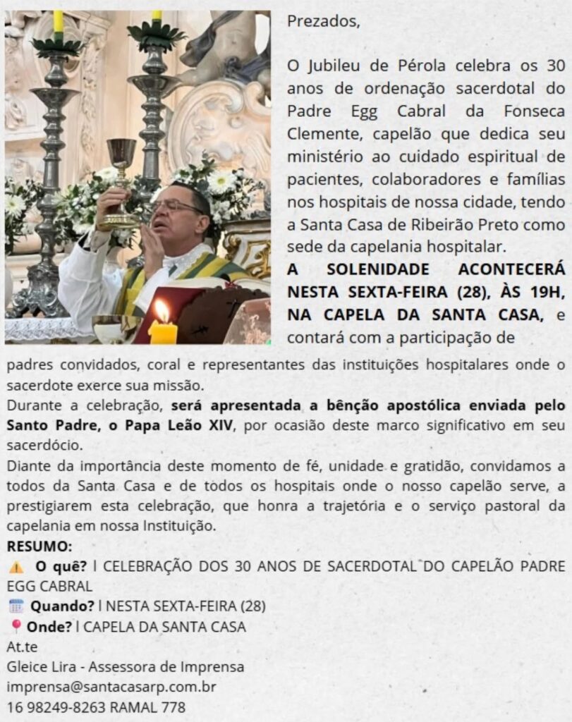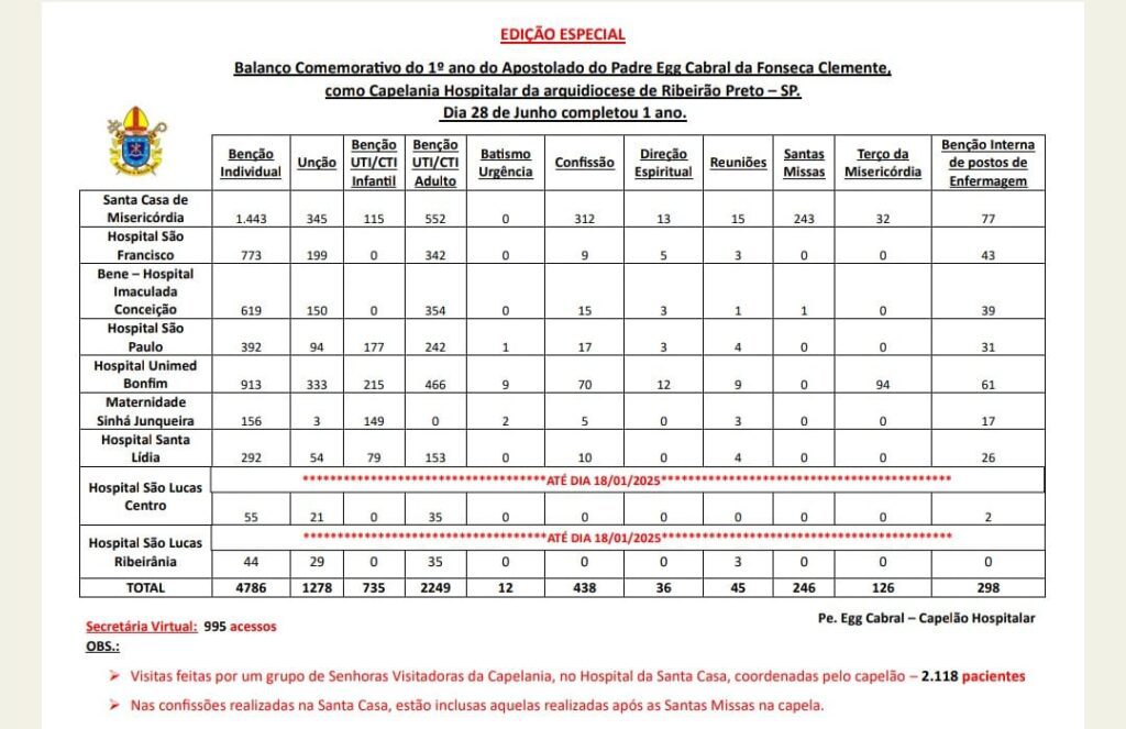 Para comemorar o primeiro aniversário de nomeação do padre Egg Cabral da Fonseca Clemente, como Capelão Hospitalar, montamos uma edição especial em números, dos atendimentos nos hospitais dentro deste primeiro ano: de 28/06/24 até 28/06/25.