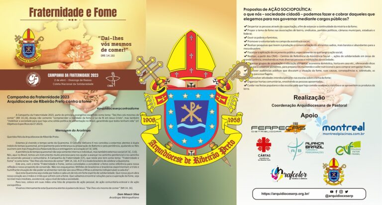 Com a inspiração no AGIR do texto-base da Campanha da Fraternidade 2023, que neste ano traz o tema: “Fraternidade e Fome” e o lema: “Dai-lhes vós mesmos de comer” (Mt 14, 16), a Coordenação Arquidiocesana de Pastoral, acaba de lançar um folder com indicações para a ação solidária no campo pessoal, comunitário e sociopolítico.