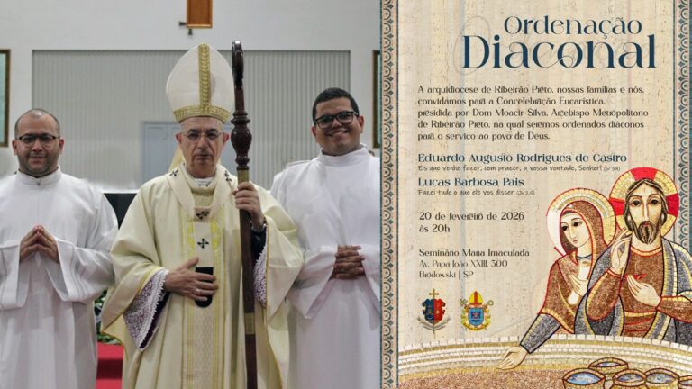 A Arquidiocese de Ribeirão Preto, nossas famílias e nós, convidamos para a Concelebração Eucarística, presidida por Dom Moacir Silva, Arcebispo Metropolitano de Ribeirão Preto, na qual seremos ordenados diáconos para o serviço ao povo de Deus: Eduardo Augusto e Lucas Barbosa