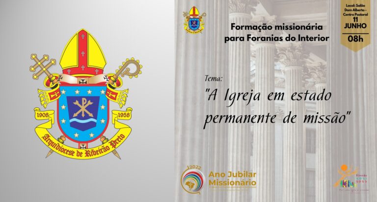 O Pilar da Ação Missionária e o Conselho Missionário Diocesano (Comidi) realizam no dia 11 de junho (sábado), às 8 horas, a Formação Missionária: Igreja em estado permanente de missão, no Salão Dom Alberto, em Ribeirão Preto.