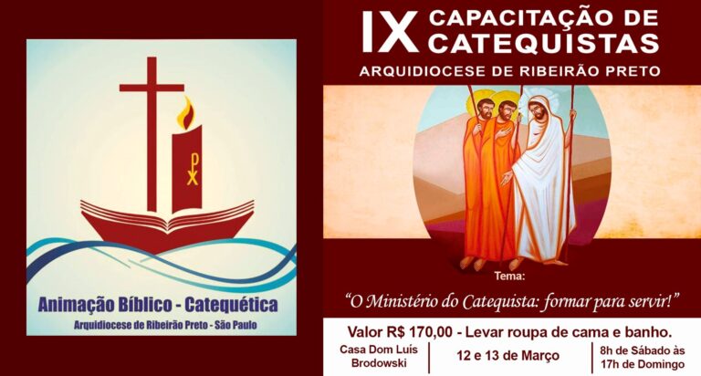 Com o tema: “O ministério do catequista: formar para servir” a Comissão Arquidiocesana de Animação Bíblico-Catequética realizará nos dias 12 e 13 de Março (Sábado e Domingo ), a IX Capacitação de Catequistas da Arquidiocese de Ribeirão Preto, na Casa Dom Luís, em Brodowski.