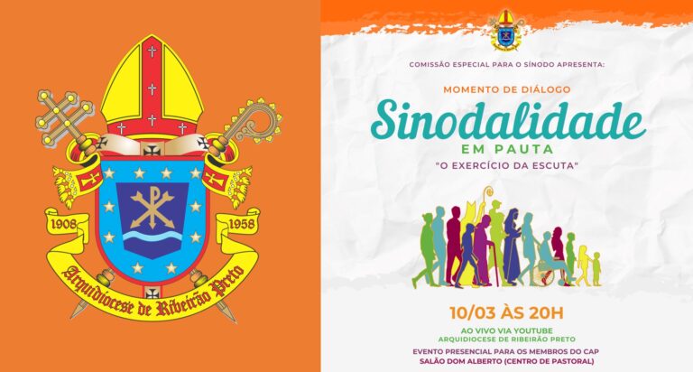 A Comissão Especial para o Sínodo realiza no dia 10 de março, às 20h, a Live: “Sinodalidade em pauta: o exercício da escuta” para aprofundar ainda mais o processo sinodal na Arquidiocese de Ribeirão Preto.