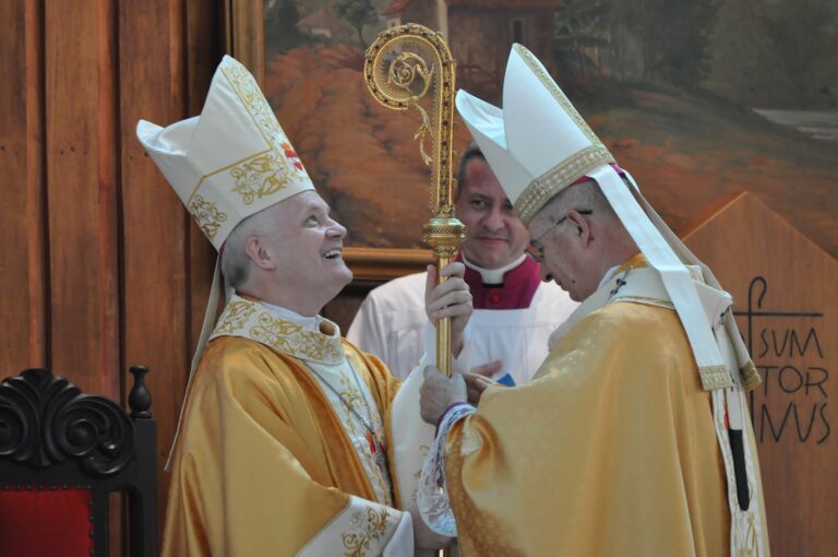 Apresentadas e lidas as Letras Apostólicas pelas quais o Santo Padre, o Papa Francisco, indicou a nomeação, o arcebispo de Ribeirão Preto e Administrador Apostólico sede vacante, dom Moacir Silva entregou a dom Vilar o báculo que um dia pertencera ao primeiro pastor diocesano local, dom Lafayette Libânio.