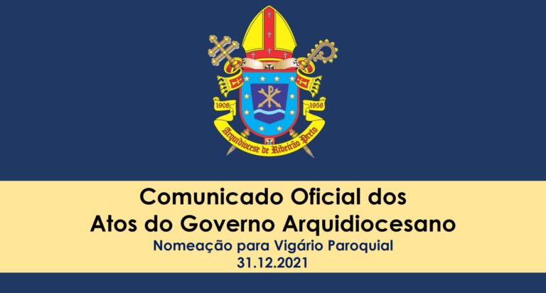 A Chancelaria da Arquidiocese de Ribeirão Preto, de acordo com as determinações do Arcebispo Metropolitano de Ribeirão Preto, Dom Moacir Silva, para atender às necessidades da Igreja particular de Ribeirão Preto e bem espiritual de seu povo, torna pública as nomeações comunicadas nesta tarde de sexta-feira, 31 de dezembro de 2021: