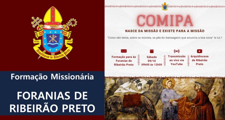 O Pilar da Ação Missionária e o Conselho Missionário Diocesano (Comidi) realizam no dia 09 de outubro (sábado), às 9 horas, a Formação Missionária on-line: COMIPA: nasce da missão e existe para a missão. O encontro tem como inspiração o versículo bíblico: “Como são belos sobre o montes, os pés do mensageiro que anuncia a boa nova” (Is 52, 7).