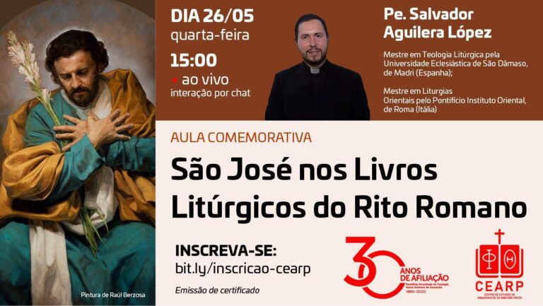 Com o tema: “São José nos livros litúrgicos romanos” o Centro de Estudos da Arquidiocese de Ribeirão Preto (Cearp), em Brodowski, realiza no dia 26 de maio, às 15 horas, a Aula Comemorativa, com a assessoria do Padre Salvador Aguilera López, Mestre em Teologia Litúrgica e Mestre em Liturgias, presbítero da Arquidiocese Primaz de Toledo (Espanha), atualmente reside em Roma, onde é oficial da Congregação para o Culto Divino e a Disciplina dos Santos.