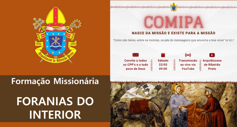 O Pilar da Ação Missionária e o Conselho Missionário Diocesano (Comidi) realizam no dia 22 de maio (sábado), às 9 horas, a Formação Missionária on-line: COMIPA: nasce da missão e existe para a missão. O encontro tem como inspiração o versículo bíblico: “Como são belos sobre o montes, os pés do mensageiro que anuncia a boa nova” (Is 52, 7).