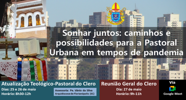 Com o tema: “Sonhar juntos: caminhos e possibilidades para a Pastoral Urbana em tempos de pandemia” e a assessoria do Padre Vânio da Silva, presbítero da Arquidiocese de Florianópolis (SC), Reitor do Seminário de Teologia Convívio Emaús e Coordenador da Pastoral Vocacional, acontece nos dias 25 e 26 de maio (terça e quarta-feira), das 8h30 às 12h, a Atualização Teológico- Pastoral do Clero; e no dia 27 de maio (quinta-feira), das 9h às 11h, a Reunião Geral do Clero.