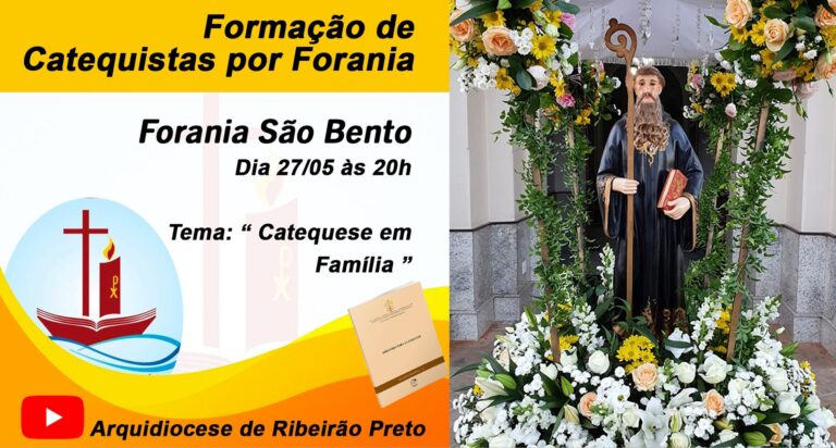 A Equipe Arquidiocesana da Animação Bíblico-Catequética promove no dia 27 de maio (quinta-feira), às 20 horas, a formação para os Catequistas das paróquias da Forania São Bento. O tema será “Catequese em Família” com base no Diretório para Catequese.