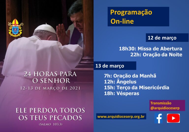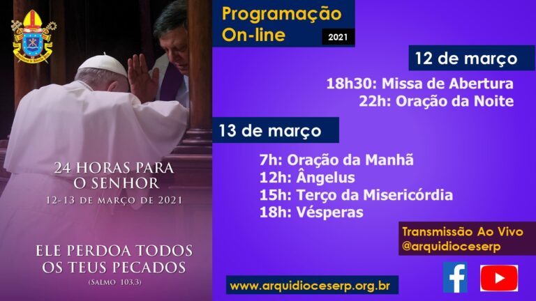 A iniciativa “24 horas para o Senhor”, convocada pelo Papa Francisco e promovido pelo Pontifício Conselho para a Promoção da Nova Evangelização, ocorre na sexta e sábado precedente ao IV Domingo da Quaresma, neste ano de 2021, será vivenciada nos dias 12 e 13 de março