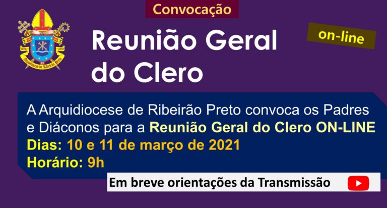 Primeira Reunião Geral do Clero – On-line de 2021: O Clero da Arquidiocese de Ribeirão Preto se reúne nos dias 10 de 11 de março, quarta e quinta-feira, com início às 9 horas, sob a presidência do arcebispo Dom Moacir Silva, para a primeira Reunião Geral do Clero deste ano de 2021.