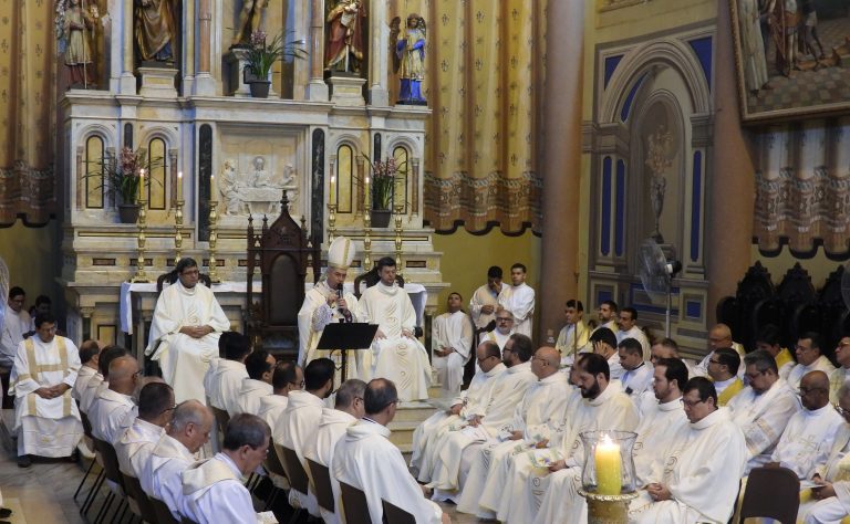 A Catedral Metropolitana de São Sebastião, em Ribeirão Preto, acolheu na manhã da Quinta-feira Santa, 17 de abril, às 9 horas, os padres, diáconos, seminaristas, candidatos da Escola Diaconal, fiéis da Arquidiocese de Ribeirão Preto para a concelebração eucarística da Missa Crismal