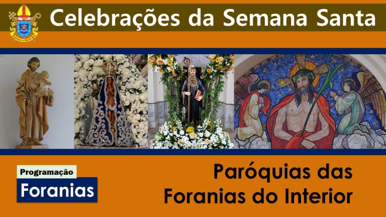 Confira a programação das celebrações da Semana Santa nas paróquias do interior da Arquidiocese (organizada por foranias): Altinópolis, Batatais, Brodowski, Cajuru, Cássia dos Coqueiros, Cravinhos, Dumont, Guatapará, Jardinópolis (Jurucê), Luiz Antônio, Pontal, Santa Cruz da Esperança, Santa Rita do Passa Quatro, Santa Rosa de Viterbo, Santo Antônio da Alegria, São Simão, Serra Azul, Serrana e Sertãozinho (Cruz das Posses)