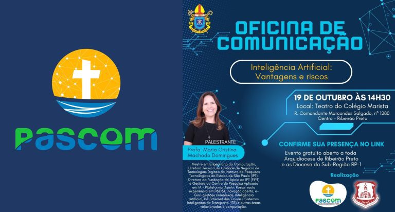 A Pascom Arquidiocesana em conjunto com a Catedral Metropolitana de São Sebastião realizará no dia 19 de outubro, sábado, às 14h30, uma Oficina de Comunicação que terá como tema “Inteligência Artificial: Vantagens e riscos”