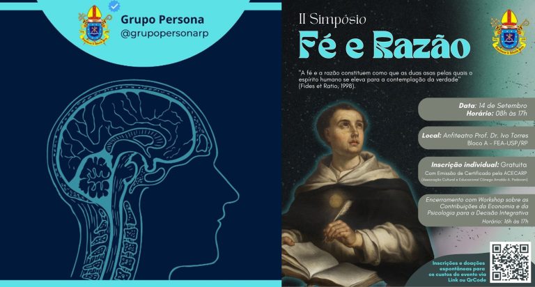 O Grupo de Estudos Persona da Arquidiocese de Ribeirão Preto promove o II Simpósio Fé e Razão. A inscrição é gratuita e haverá certificado emitido pela Associação Cultural e Educacional Cônego Arnaldo Álvaro Padovani de Ribeirão Preto (ACECARP).
