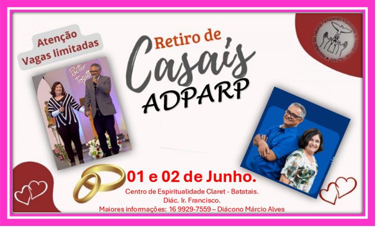 A Associação dos Diáconos Permanentes da Arquidiocese de Ribeirão Preto (ADPARP) realiza nos dias 1 e 2 de junho, no Centro de Espiritualidade Claret (Comunidade Missionária Divina Misericórdia), em Batatais, o Retiro de Casais Adparp