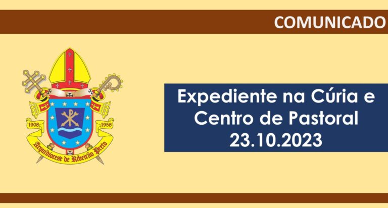 A Arquidiocese de Ribeirão Preto informa que a Cúria Metropolitana e o Centro Arquidiocesano de Pastoral, na segunda-feira, 23 de outubro de 2023, excepcionalmente, terá o seguinte horário de expediente: 10h às 12h e 13h às 17h