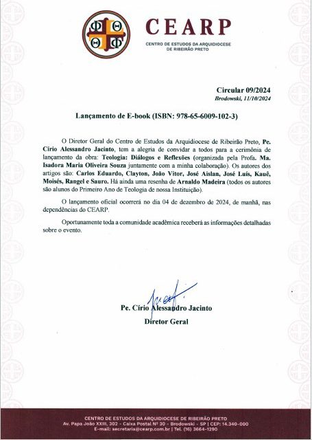 O Centro de Estudos da Arquidiocese de Ribeirão Preto convida para a cerimônia presencial (corpo docente e discente do Cearp) e on-line de lançamento do E-book: “Teologia: diálogo e reflexões”, obra organizada pelos professores Pe. Dr. Círio Alessandro Jacinto e Ma. Isadora Maria Oliveira Sousa, em 04 de dezembro, às 8h, nas dependências do CEARP.