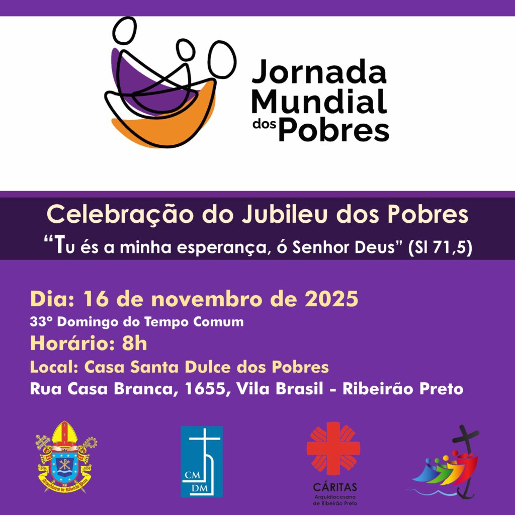 A Comissão Arquidiocesana para o Jubileu 2025, a Cáritas Arquidiocesana de Ribeirão Preto, a Comunidade Missionária Divina Misericórdia, as Pastorais Sociais, e a Coordenação Arquidiocesana de Pastoral, motivam e convidam todas as paróquias a celebrarem o Jubileu dos Pobres, na IX Jornada Mundial dos Pobres, em 16 de novembro (33º Domingo do Tempo Comum), às 8h, em celebração eucarística presidida pelo Arcebispo Dom Moacir Silva, na Casa Santa Dulce dos Pobres, na Rua Casa Branca, 1655, Vila Brasil, em Ribeirão Preto. Após a missa haverá um café com as pessoas em situação de rua.