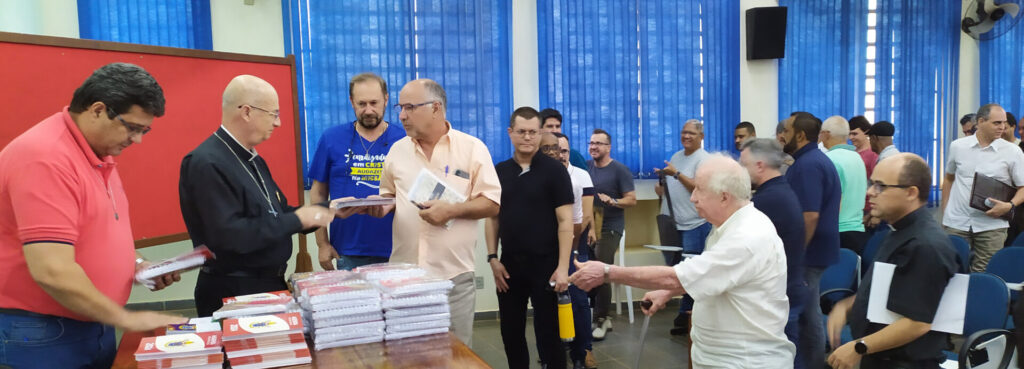 Encerramento: Ao finalizar a reunião, após a oração e bênção, o arcebispo dom Moacir entregou aos padres e diáconos um exemplar da Agenda Arquidiocesana 2024, o Diretório da Liturgia e da Organização da Igreja no Brasil 2024 e o Caderno de Aniversários do Clero 2024.