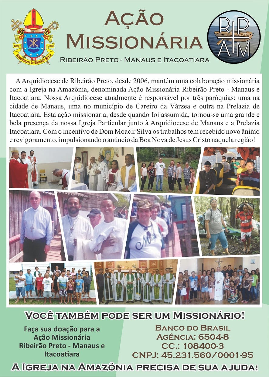 A Arquidiocese de Ribeirão Preto, desde 2006, mantém uma colaboração missionária com a Igreja na Amazônia, denominada Ação Missionária Ribeirão Preto – Manaus e Itacoatiara. Nossa Arquidiocese atualmente é responsável por três paróquias: uma na cidade de Manaus, uma no município de Careiro da Várzea e outra na Prelazia de Itacoatiara. Esta ação missionária, desde quando foi assumida, tornou-se uma grande e bela presença da nossa Igreja Particular junto à Arquidiocese de Manaus e a Prelazia Itacoatiara. Com o incentivo de Dom Moacir Silva os trabalhos tem recebido novo ânimo e revigoramento, impulsionando o anúncio da Boa Nova de Jesus Cristo naquela região!