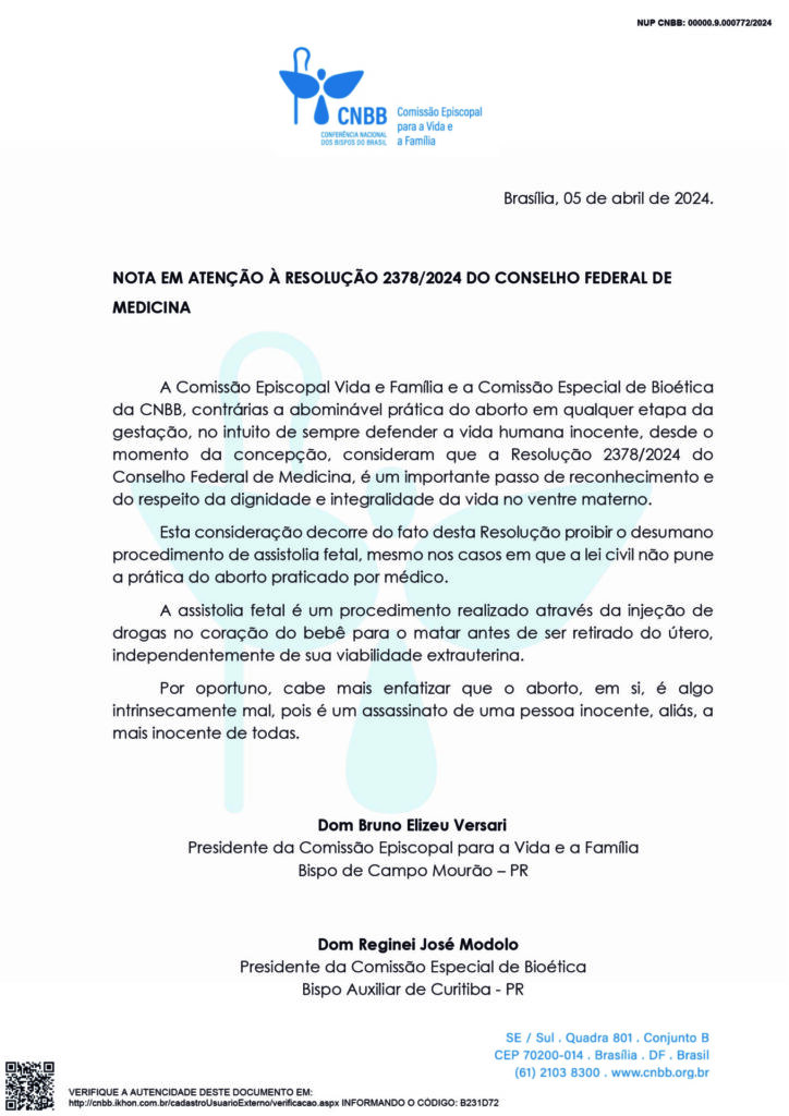 A Comissão Especial de Bioética e a Comissão Episcopal para a Vida e a Família da Conferência Nacional dos Bispos do Brasil (CNBB) divulgaram nesta sexta-feira, 5 de abril, uma nota em atenção à Resolução nº 2378/2024, do Conselho Federal de Medicina.