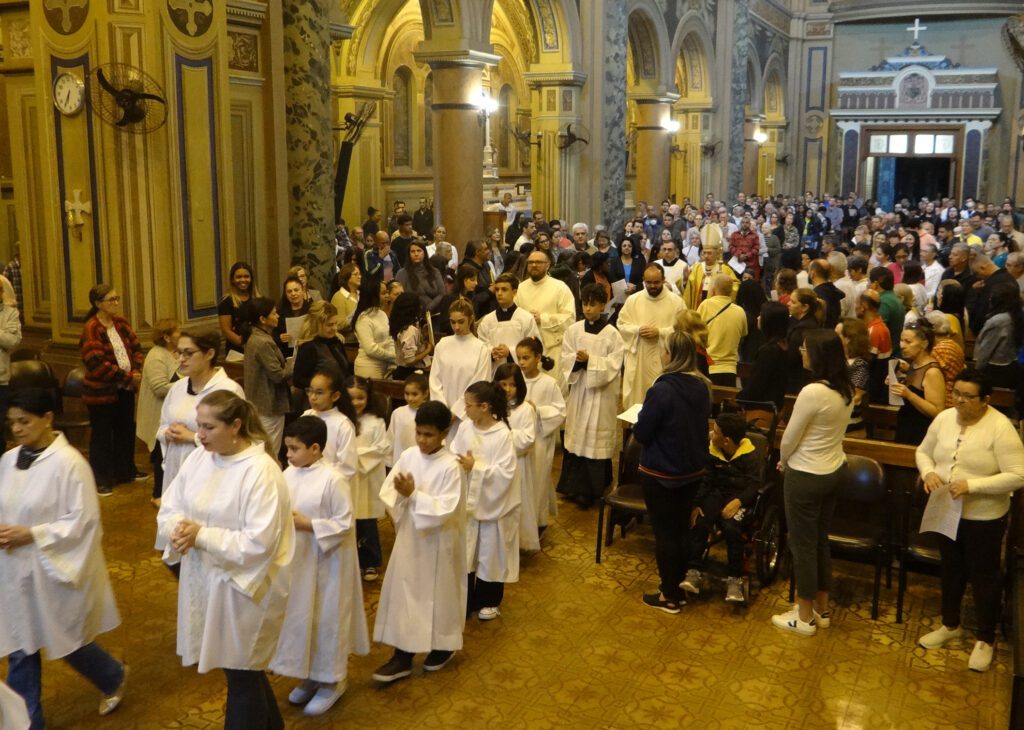 Ao finalizar a homilia, dom Moacir salientou a responsabilidade trazida pelo o ato de comungar e a exigência de nos tornarmos pessoas eucarísticas. “A Eucaristia é Dom que exige responsabilidade; responsabilidade de partilhar, com os outros, os dons que cada um tem; a responsabilidade de fazer de si um dom para o bem dos outros (em casa, na família, no trabalho, na escola, enfim, onde estivermos). Comungando o Cristo no sacramento da Eucaristia, nos tornamos pessoas eucarísticas. Na Eucaristia, realiza-se o sonho de todo ser humano, a felicidade e a liberdade, que consistem em servir ao próximo, do mesmo modo como Jesus. Na oferta de sua vida, no seu sacrifício, experimentamos o amor do Senhor por cada ser humano. A Eucaristia é para todos nós, o meio privilegiado para permanecermos em Cristo e para Cristo permanecer em nós, a fim de podermos produzir muitos frutos de amor, de serviço aos irmãos, de fraternidade, de solidariedade, de santidade. Peçamos a Nosso Senhor a graça de compreender, cada vez mais, as lições, as exigências, e os apelos que a Eucaristia nos faz. Que o Cristo Jesus, nos ajude a vivermos melhor a nossa comunhão eucarística, hoje e sempre. Amém!”, concluiu o arcebispo.