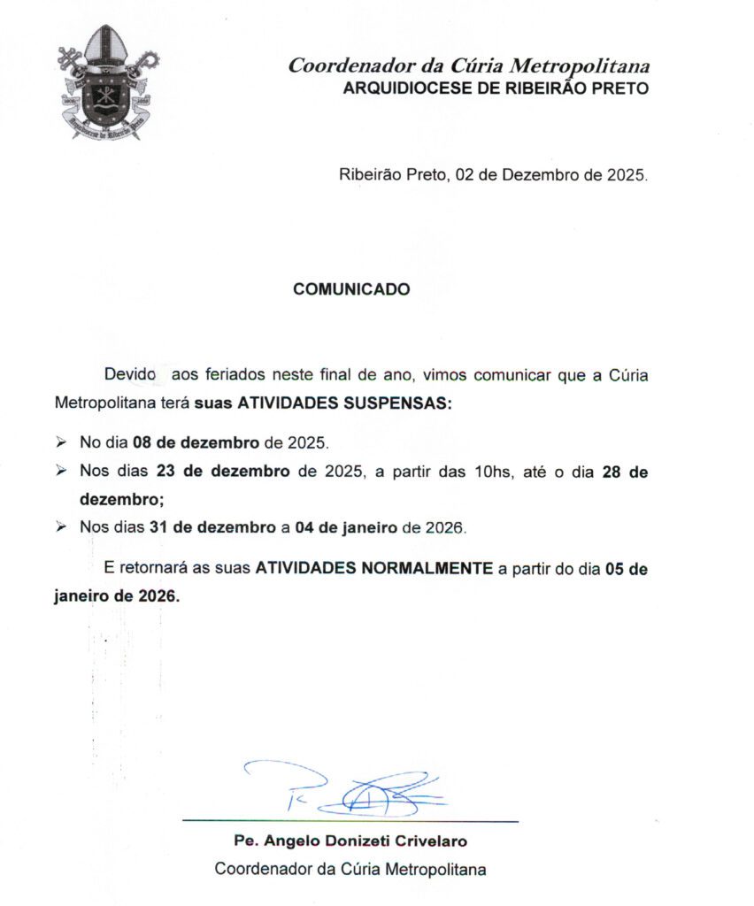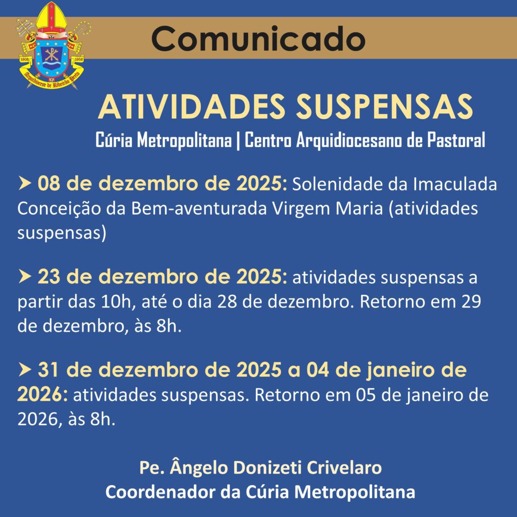 Devido aos feriados neste final de ano, vimos comunicar que a Cúria Metropolitana terá suas ATIVIDADES SUSPENSAS: