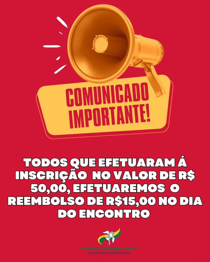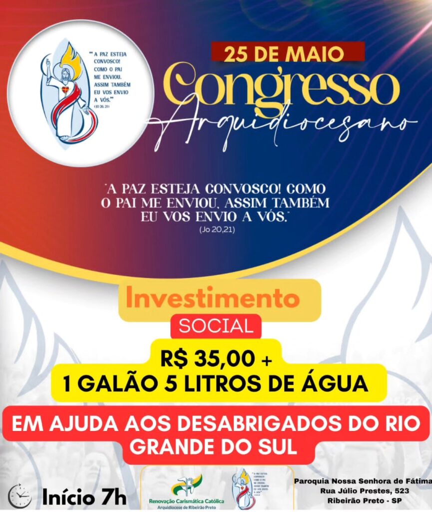 É com alegria e fervor que convidamos você a se juntar a nós no dia 25 maio de 2024, com novas mudanças em prol de ajudar nossos irmãos do Rio Grande do Sul e o encontro será a partir das 7h, na Paróquia Nossa Senhora de Fátima(Estigmatinos), para uma experiência única de fé e renovação no Congresso Arquidiocesano da Renovação Carismática Católica de Ribeirão Preto. O Congresso é aberto a participação de todos.