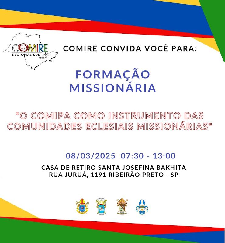 Com o desejo de contribuir ativamente à caminhada missionária do Regional Sul 1 da CNBB, o Conselho Missionário Regional – COMIRE Sul 1 – CNBB promoverá a realização de Formação Missionária na Arquidiocese de Ribeirão Preto que compreende a Sub-Região de Ribeirão Preto I (Arquidiocese de Ribeirão Preto, Diocese de Jaboticabal, Diocese de Franca e Diocese de São João da Boa Vista), em 08 de março, das 7h30 às 13h, na Casa Bakhita, em Ribeirão Preto.