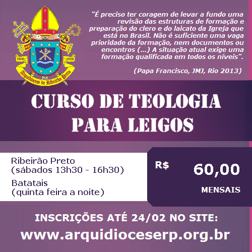 O Curso de Teologia para Leigos quer ajudar a compreender melhor a nossa fé a partir da Sagrada Escritura e da Tradição da Igreja; mergulhando no mistério de Cristo e na liturgia; caminhando pela História da Igreja e pelos dogmas para formar autênticos discípulos missionários para trabalhar na vinha do Senhor!