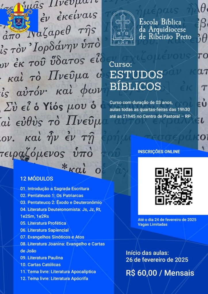 A Escola Bíblica da Arquidiocese de Ribeirão Preto retoma as atividades formativas do “Curso Estudos Bíblicos” com a abertura de novas turmas para o ano de 2025. O curso conta com 12 módulos e tem a duração de três anos (março/junho e agosto/novembro). As aulas ocorrem às quartas-feiras, das 19h30 às 21h45, nas dependências do Centro Arquidiocesano de Pastoral, na Rua Tibiriçá, 899, na região central de Ribeirão Preto.