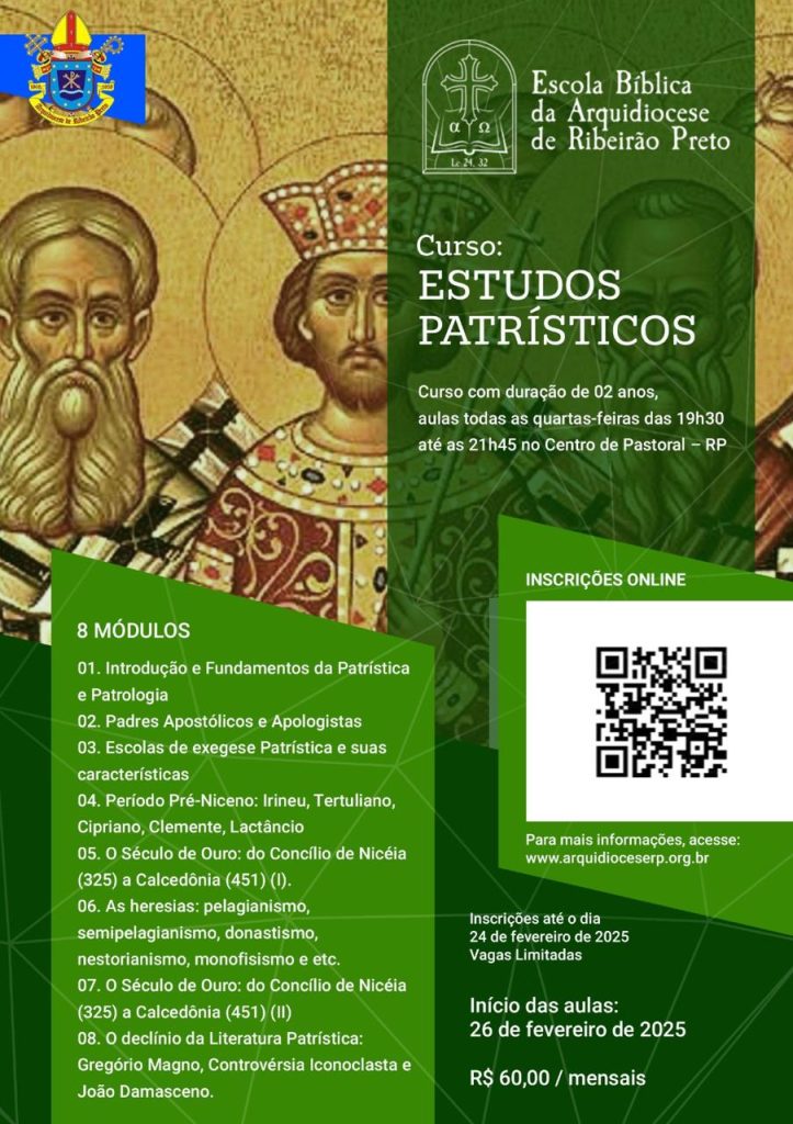 A Escola Bíblica da Arquidiocese de Ribeirão Preto está com inscrições abertas para o “Curso Estudos Patrísticos” que mergulhará na continuidade dos estudos bíblicos, agora ampliando a reflexão para a tradição dos padres da Igreja. No ano de 2025 a nova turma inicial abordará os módulos 1, 2 3 e 4. A turma do segundo ano, para quem concluiu o primeiro ano em 2024, estudará os módulos 5, 6, 7 e 8.