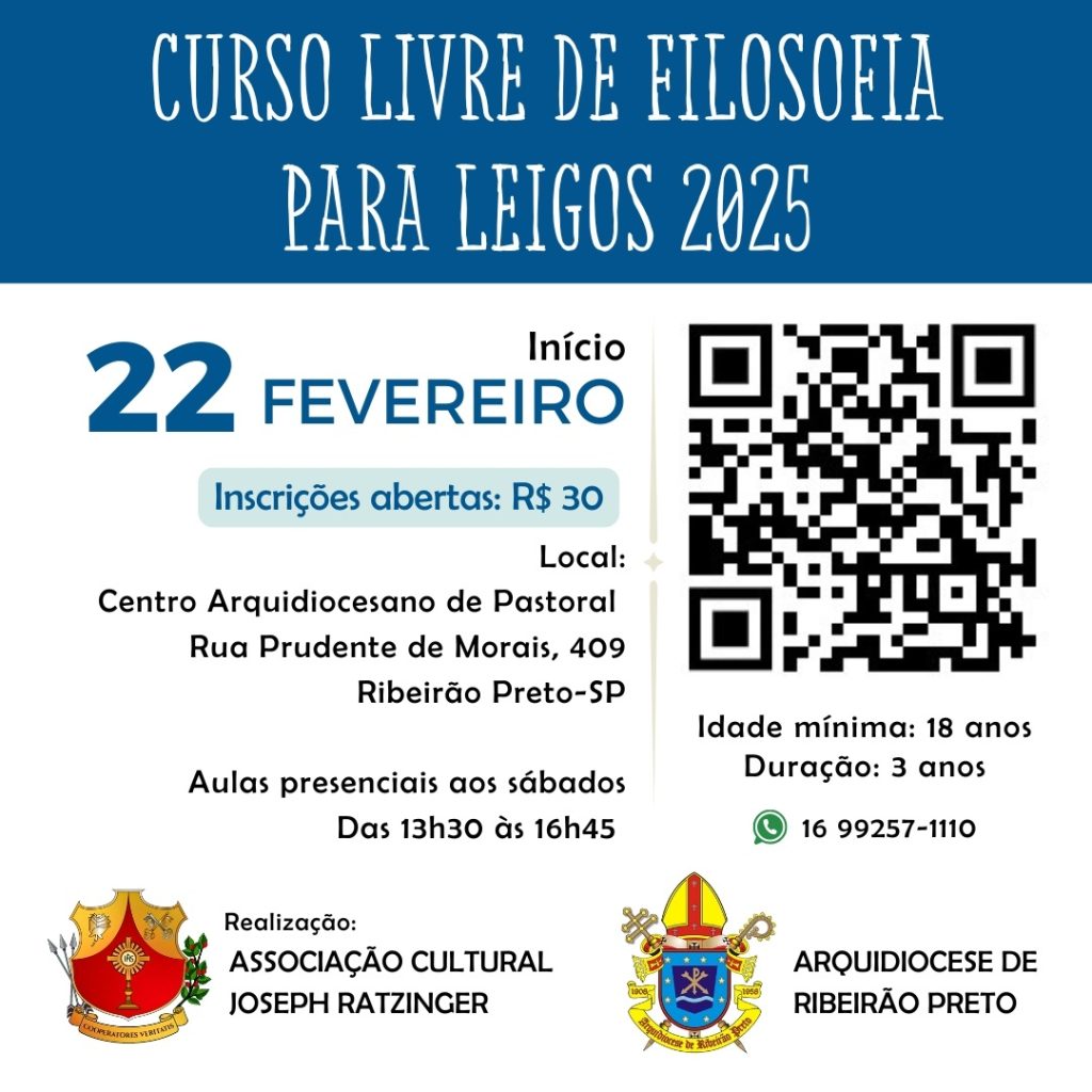 A Associação Cultural Joseph Ratzinger e Arquidiocese de Ribeirão Preto abrem as inscrições para a primeira turma do Curso Livre de Filosofia para Leigos. O curso terá duração de três anos com aulas presenciais aos sábados, das 13h30 às 16h45, no Centro Arquidiocesano de Pastoral, na Rua Prudente de Morais, 409, Centro, em Ribeirão Preto.